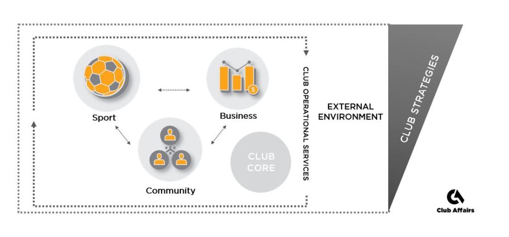 Some common themes for clubs are the position of the football department in relation to the overall structure, as well as the decision-making process in respect of football matters. Very schematically, it is possible to talk about football clubs being built on three pillars of sport, business and community, with an internal operational environment around them, a further external environment and an important strategy function that gives sense and direction to the way the organisation develops in the medium to long-term: